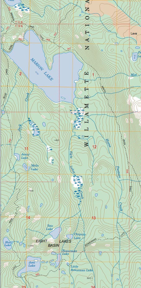 There are two ways in to Blue and Jorn Lakes: Blue Lake Trail 3422 which goes south from Marion Lake, and Duffy Lake Trail 3427 (not on this map) which goes north from Big Meadows and winds past Duffy Lake, Mowich Lake, etc. on its way to its terminus at the end of the Blue Lake Trail. Like our grandparent’s path to school, both ways are uphill.